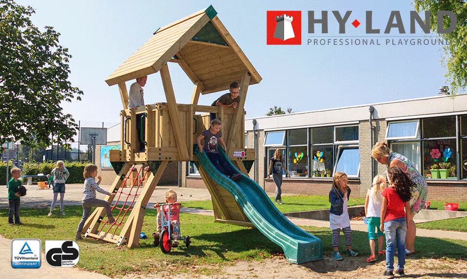 Hy-land’s professional playground equipment complies with the EN 1176-2018 standard ensuring optimal safety. Whether they are placed in a restaurant, school, kindergarten, or sports club, our GS-certified play structures guarantee secure and long lasting fun! Explore our diverse range of offerings today.